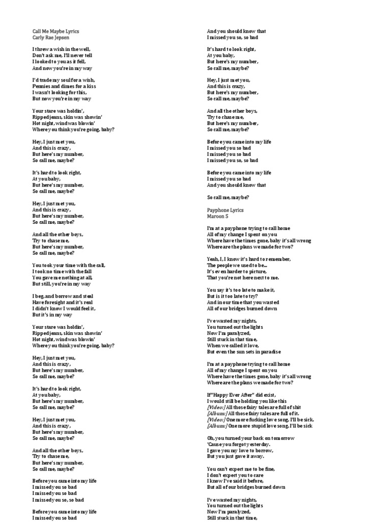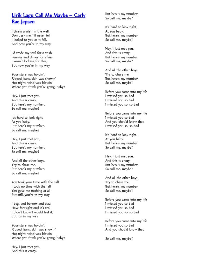 Lirik Lagu Gue On Twitter Hey I Just Met You And This Is Crazy But Here S My Number So Call Me Maybe Carly Rae Jepson Call Me Maybe Llg