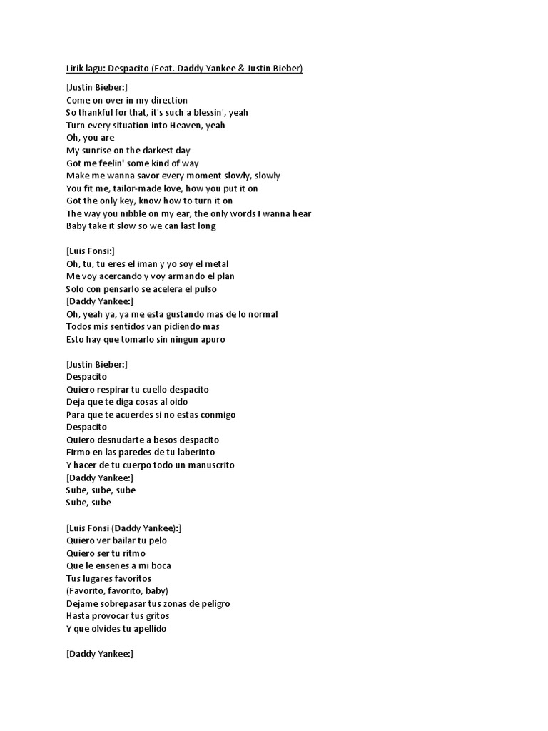 Lirik Lagu Luis Fonsi Daddy Yankee Despacito Remix Feat Justin Bieber Dan Terjemahan Arti Lirik Lagu Makna Maksud Dan Terjemahan Lirik Lagu Barat