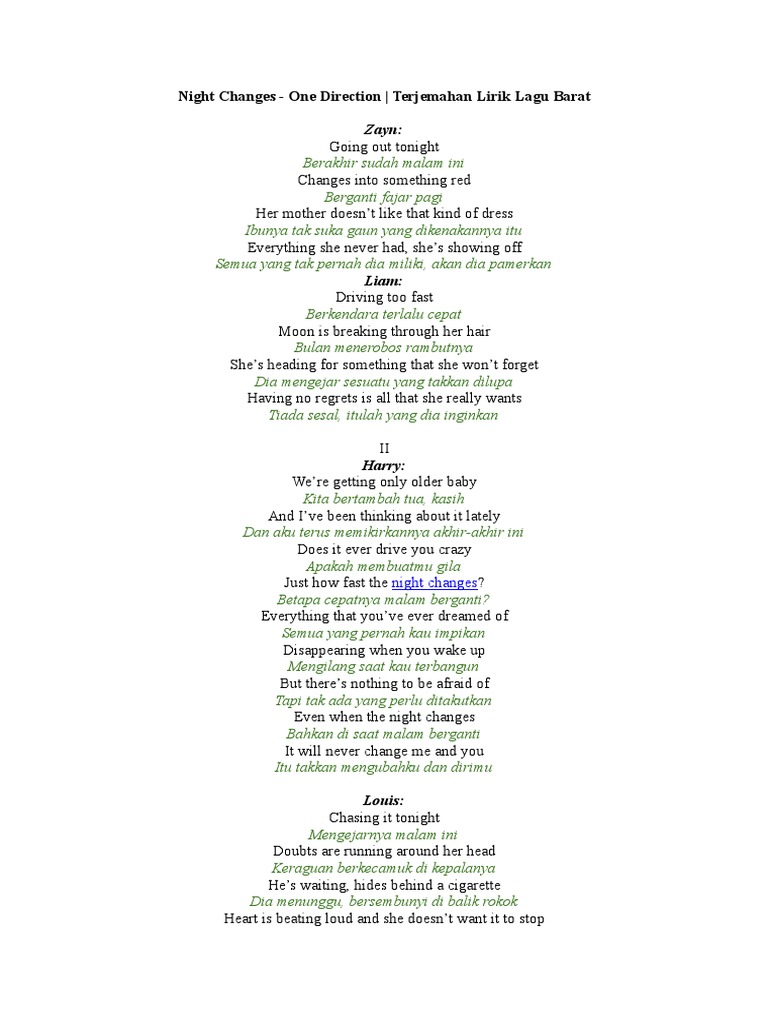 1d Night Changes Lirik Lagu Terjemahan Bahasa Indonesia Youtube