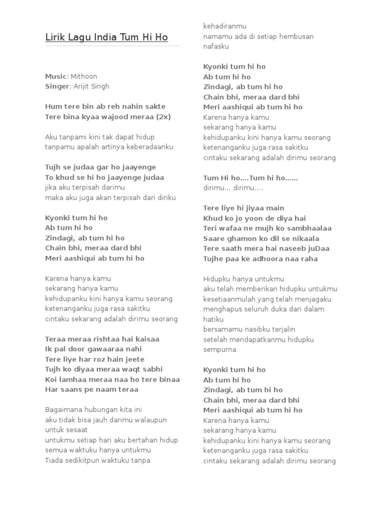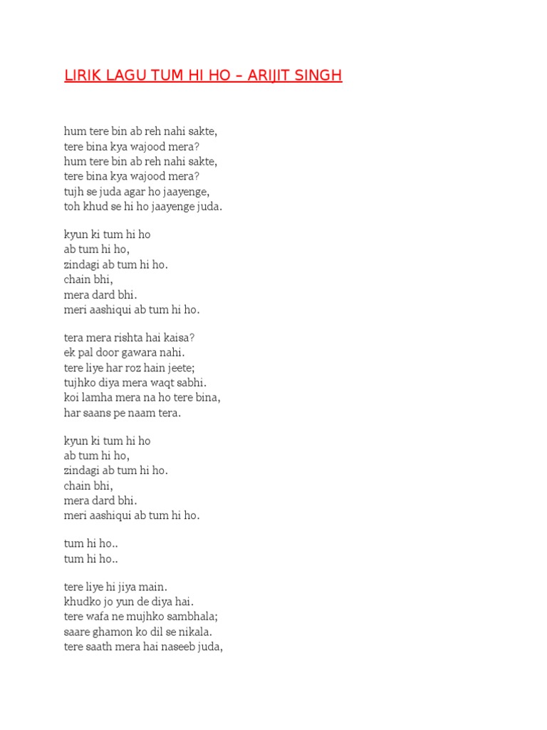 Lirik Lagu India Tum Hi Ho Yang Dipopulerkan Oleh Arijit Singh Sonora Id