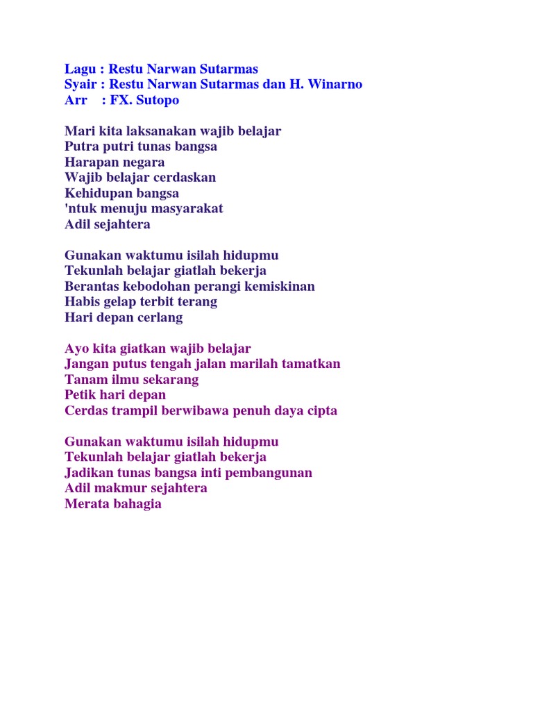 Lirik Lagu Wajib Belajar Ciptaan Bpk Restu Narwan Sutarmas Dinas Dikbud Kabupaten Tebo