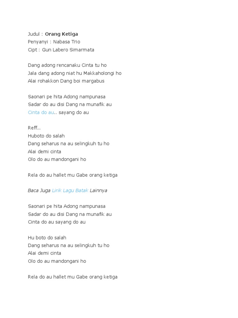 Lirik Lagu Batak Orang Ketiga By Nabasa Trio