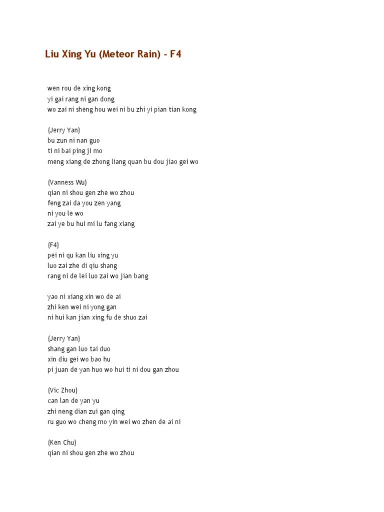 Liu Xing Yu Ƶæé¨meteor Shower Lyrics Æè©with Pinyin By F4 Chinese Song