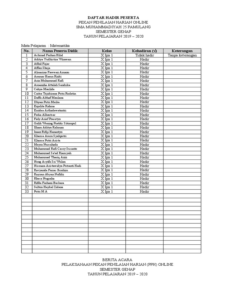 Contoh Format Daftar Hadir Manual Tahun 2020 Mi Literasi Miftahul Huda