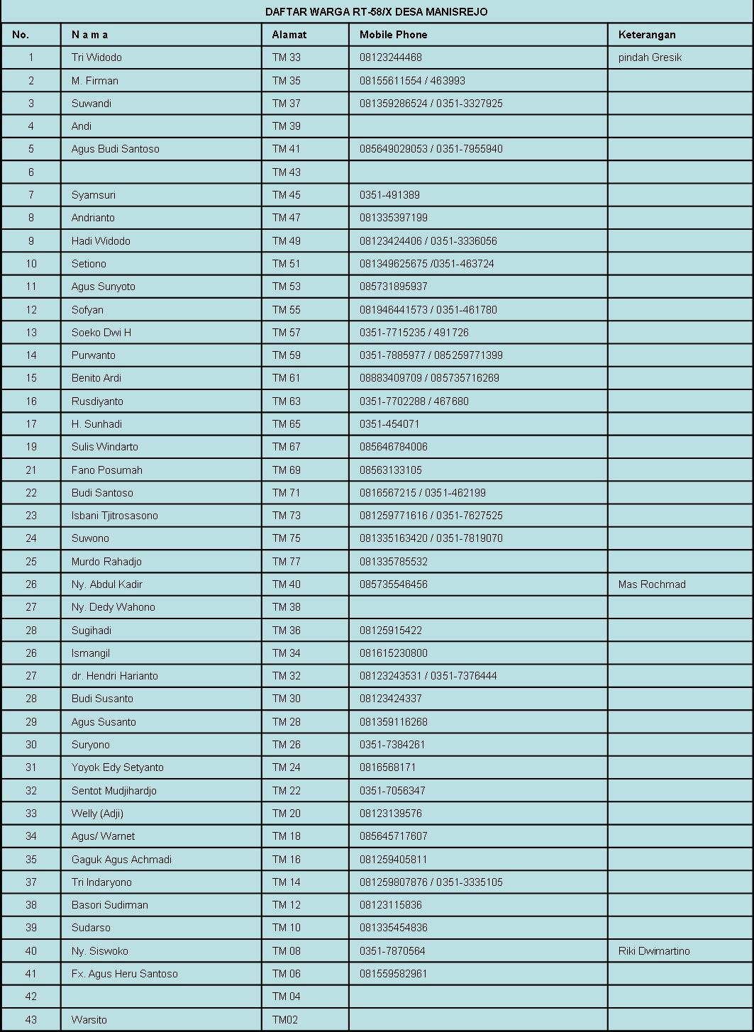 Rt 58 Manisrejo Daftar Telepon Hp Warga Rt 58
