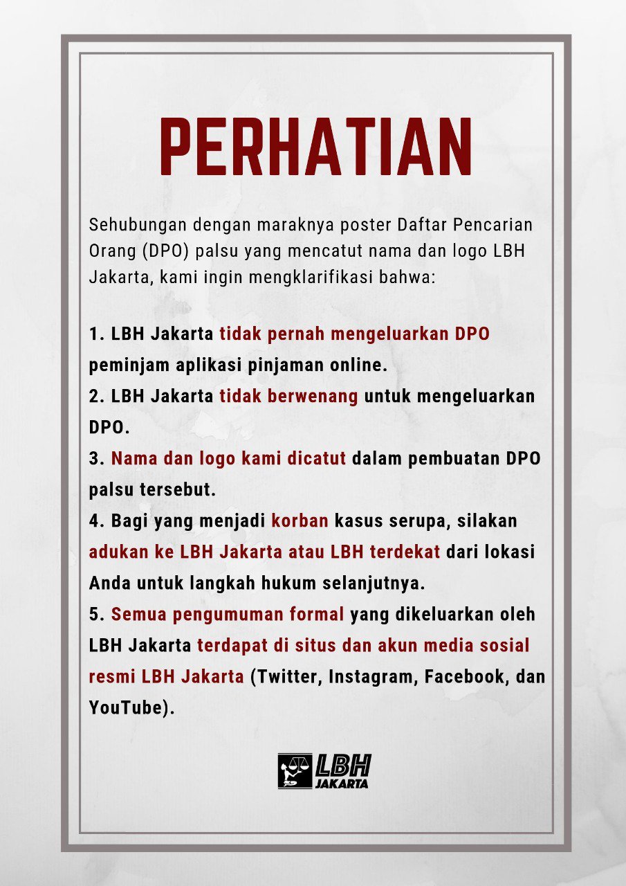 Lbh Jakarta Twitterren Perhatian Sehubungan Dengan Maraknya Daftar Pencarian Orang Dpo Palsu Peminjam Pinjol Yang Mencatut Nama Dan Logo Lbh Jakarta Kami Ingin Mengklarifikasi Bahwa Https T Co Cxx4dlccjx