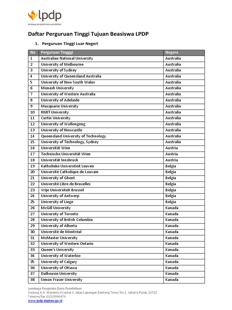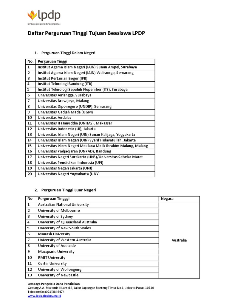Daftar Perguruan Tinggi Tujuan Beasiswa Lpdp Pdf Download Gratis