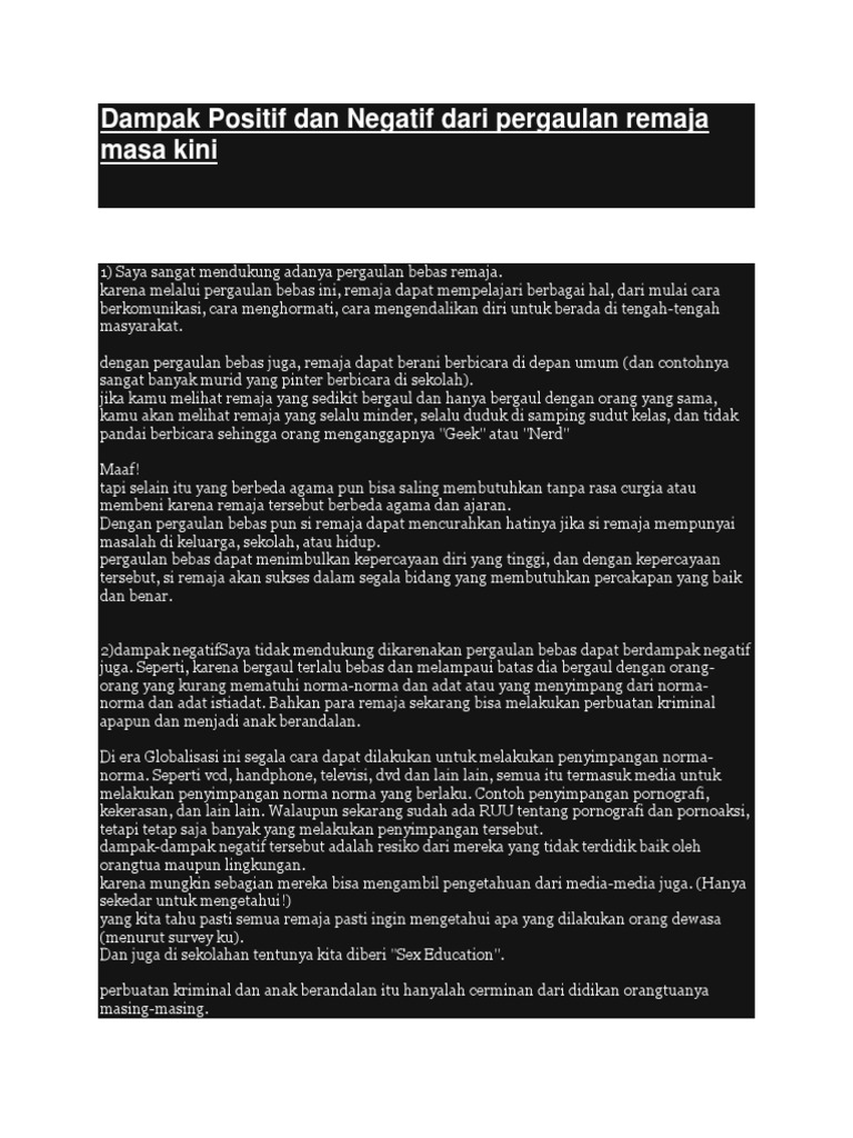 Tuiskan 5 Dampak Positif Dan Negatif Tentang Pergaulan Bebas Brainly Co Id
