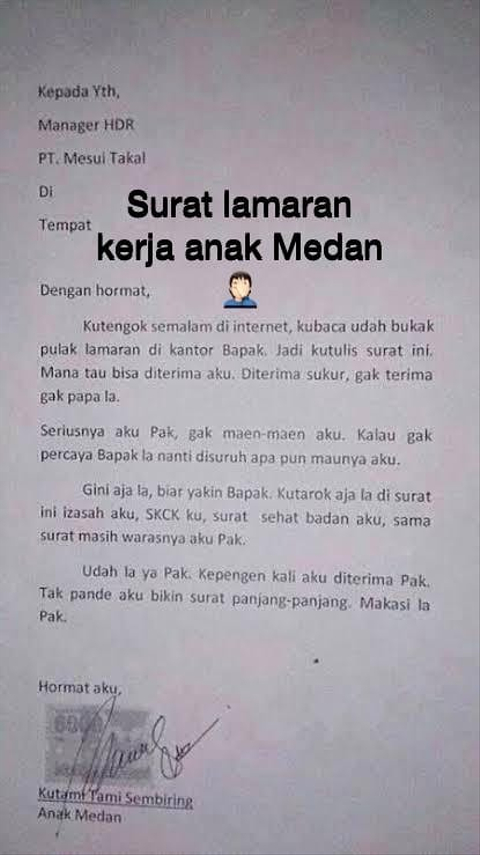 Lucunya Pelamar Kerja Ini Kirim Surat Lamaran Pakai Logat Medan Kumparan Com
