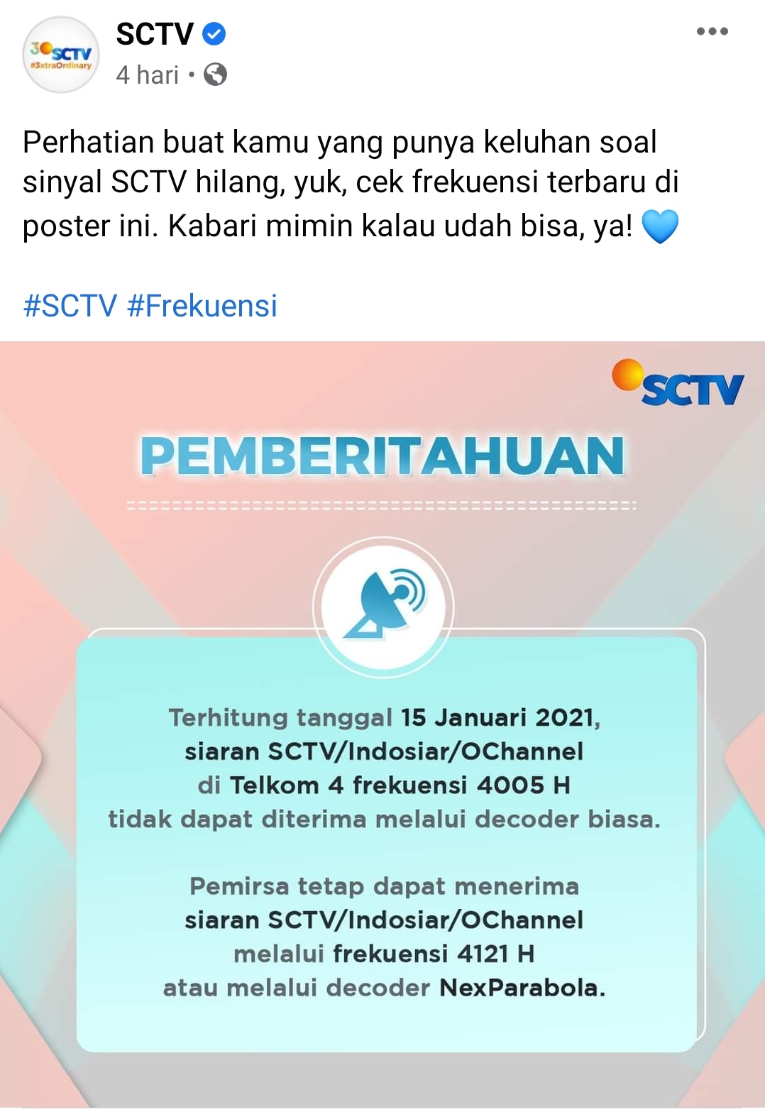 Frekuensi Indosiar Sctv Pindah Channel Tp 4121 H 12250 Mpeg4 Telkom 4 C Band Mulai 15 Januari 2021 Aulaku