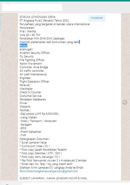 Contact Center Ap Ii On Twitter Berikut Salah Satu Contoh Bentuk Penipuan Lowongan Pekerjaan Yang Mengatasnamankan Pt Angkasa Pura Ii Persero Harap Berhati Hati Https T Co Vbu14k8nb1