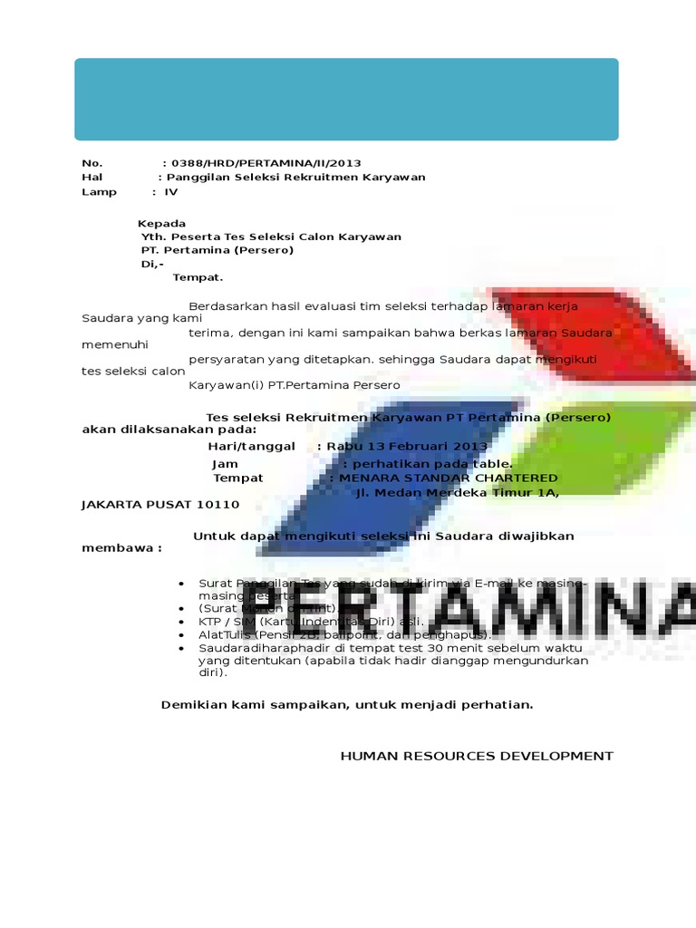 Surat Panggilan Tes Dari Pt Pertamina Ke Jakarta