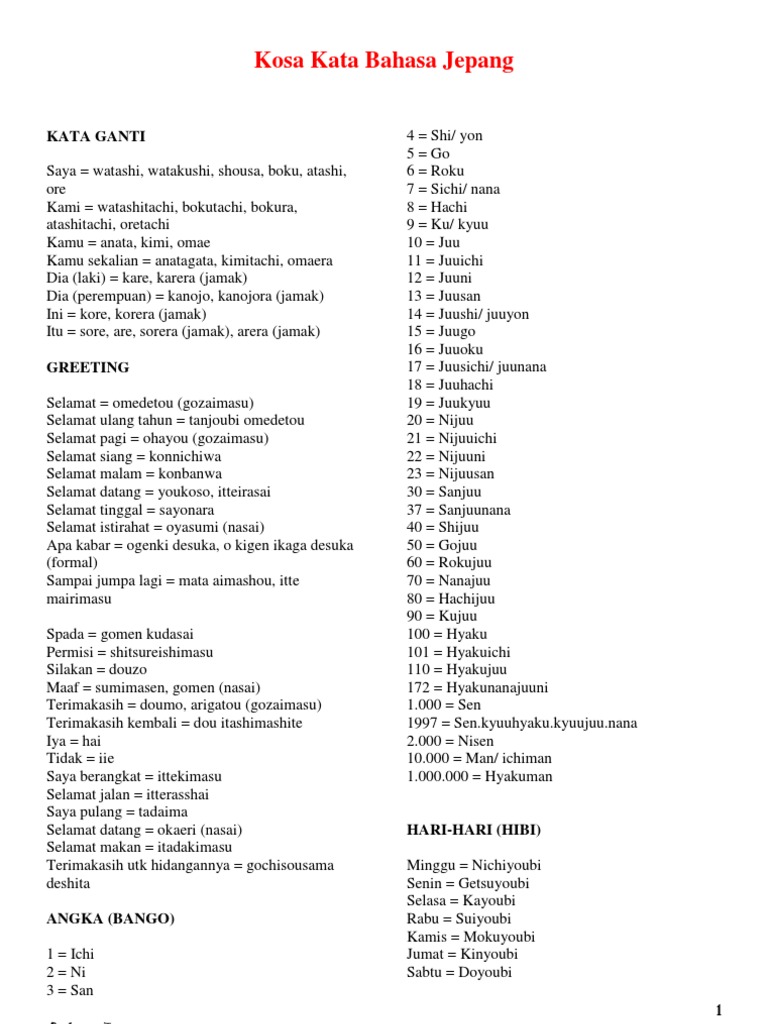 Kumpulan Kosakata Bahasa Jepang Lengkap Dengan Artinya