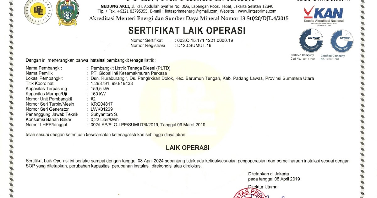 Harga Sertifikat Laik Operasi Pt Andalan Mutu Energi