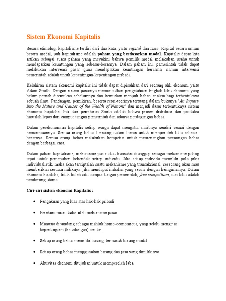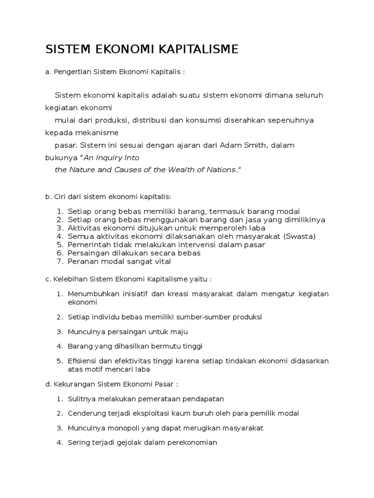 Sistem Ekonomi Kapitalis Belajar Ilmu Ekonomi