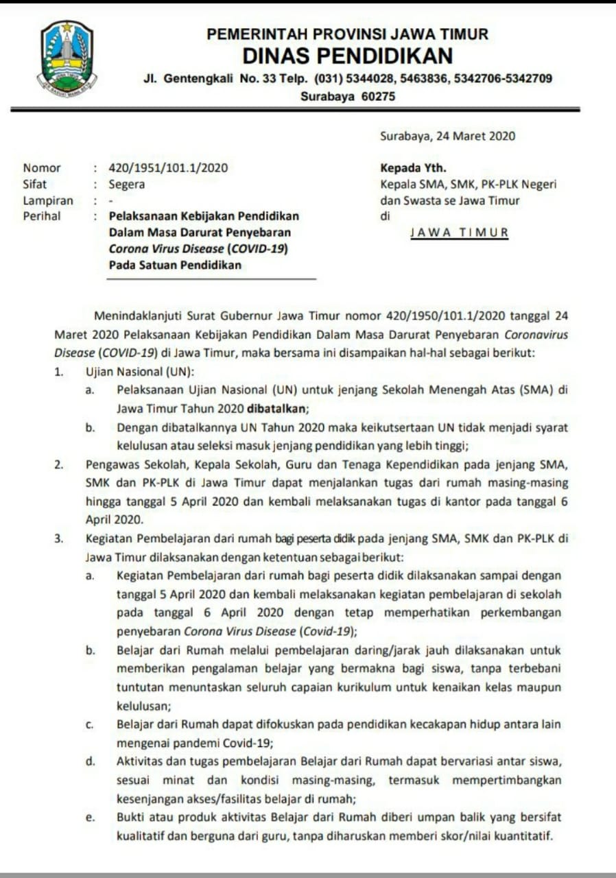 Surat Edaran Kepala Dinas Pendidikan Provinsi Jawa Timur 21 Maret 2020 Sma Negeri 2 Ngawi