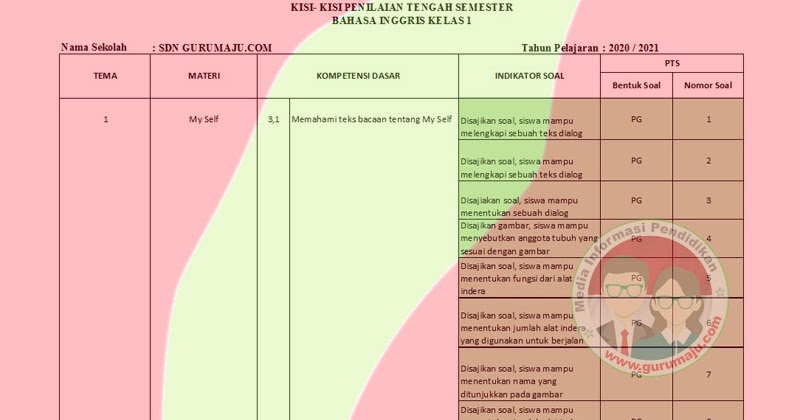 Kisi Kisi Soal Uts Pts Bahasa Inggris Kelas 1 Sd Semester 1 K13 Guru Maju