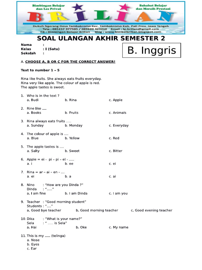 Soal Uas Bahasa Inggris Kelas 1 Sd Semester 1 Ganjil Dan Kunci Jawaban Bimbel Brilian