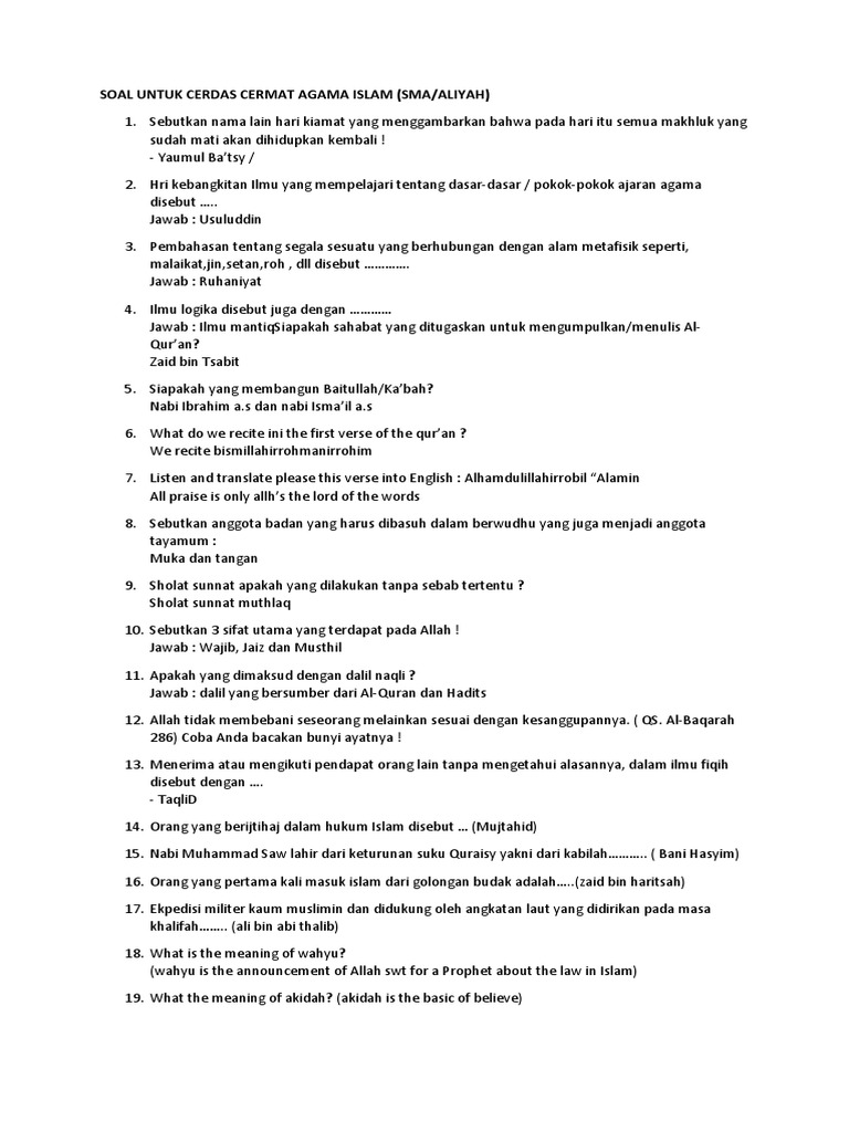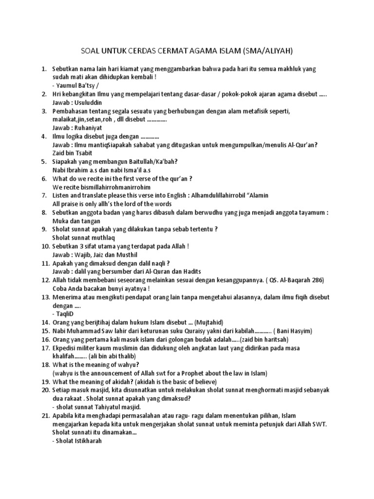 Soal Dan Jawaban Cerdas Cermat Agama Islam Tingkat Sma