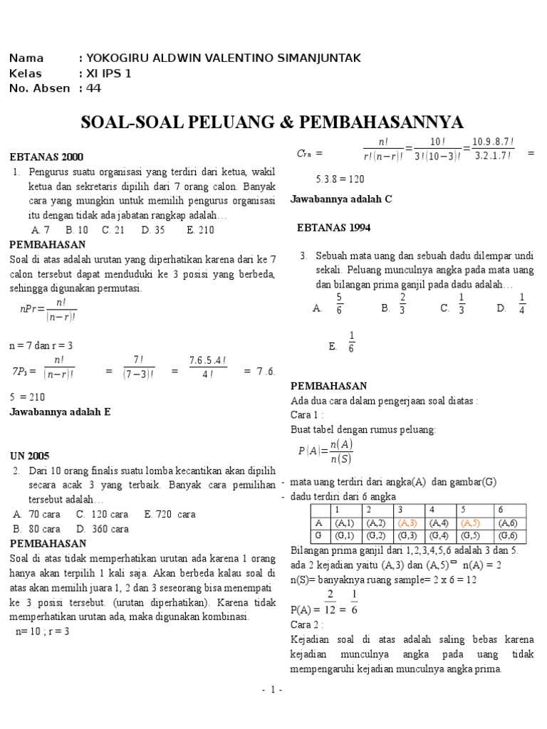 Soal Dan Pembahasan Peluang Dan Kombinatorika Tingkat Sma Mathcyber1997