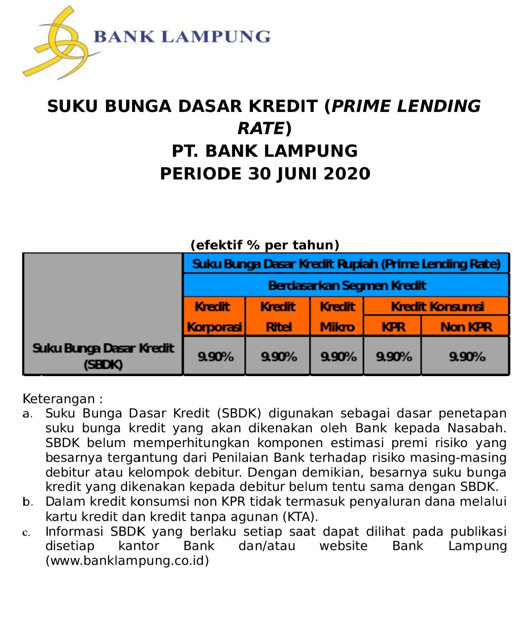 Suku Bunga Dasar Kredit Bank Lampung Periode 30 Juni 2020 Konkrit News
