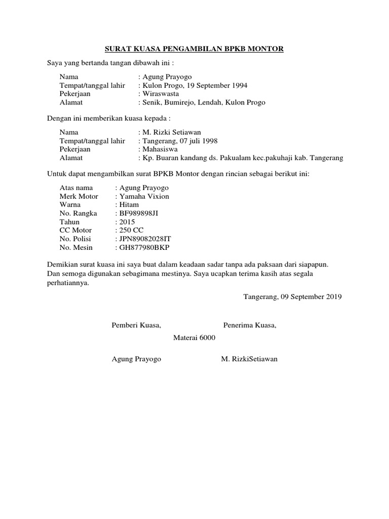 Contoh Surat Kuasa Pengambilan Bpkb Motor Teknik Otomotif Co Id