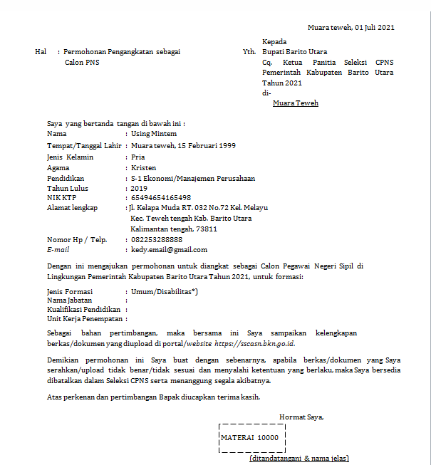 Contoh Surat Lamaran Untuk Pelamar Umum Cpns Kabupaten Tanah Laut