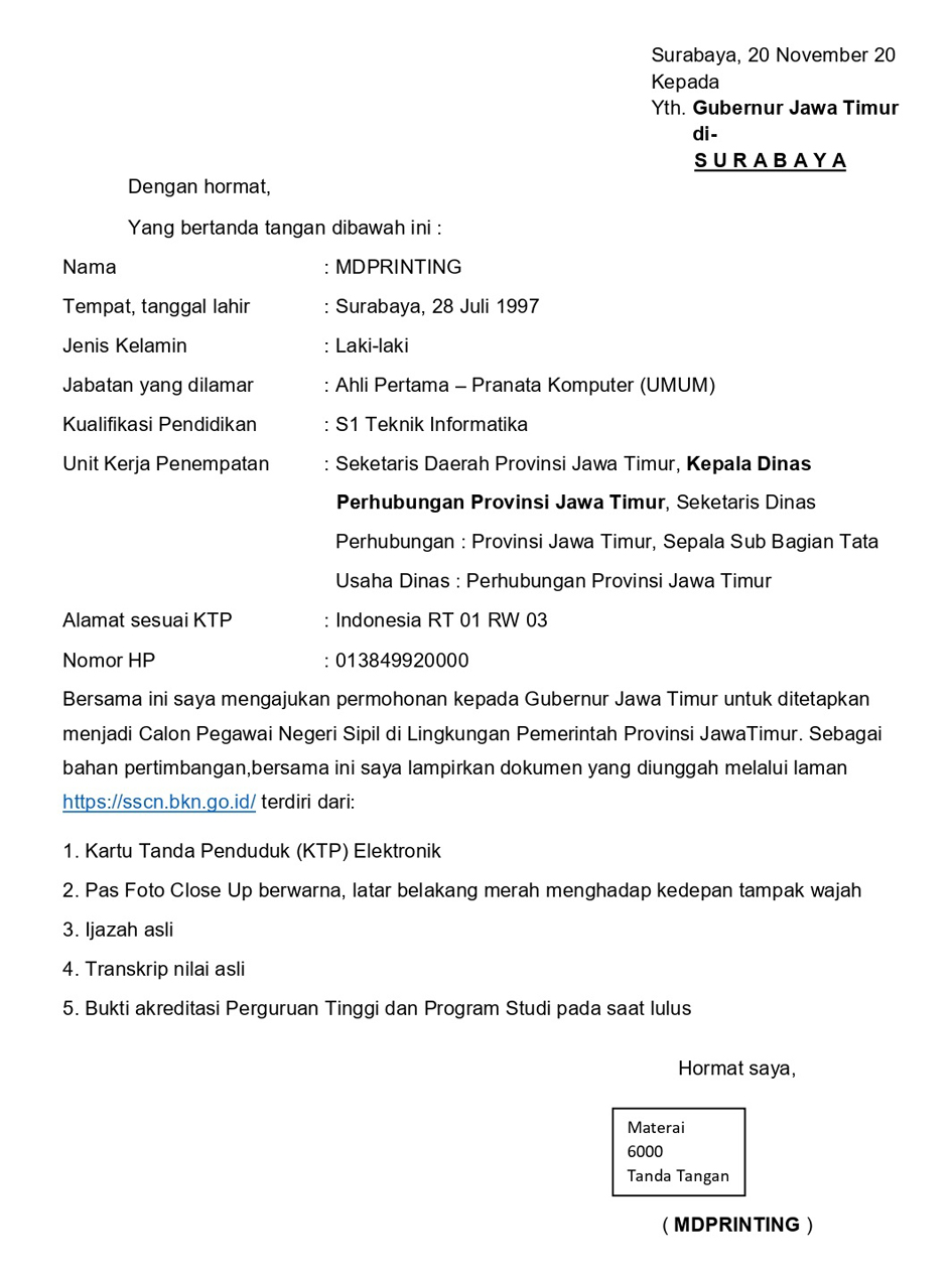 Contoh Surat Lamaran Calon Pegawai Negeri Sipil Cpns 2020 Mdprinting