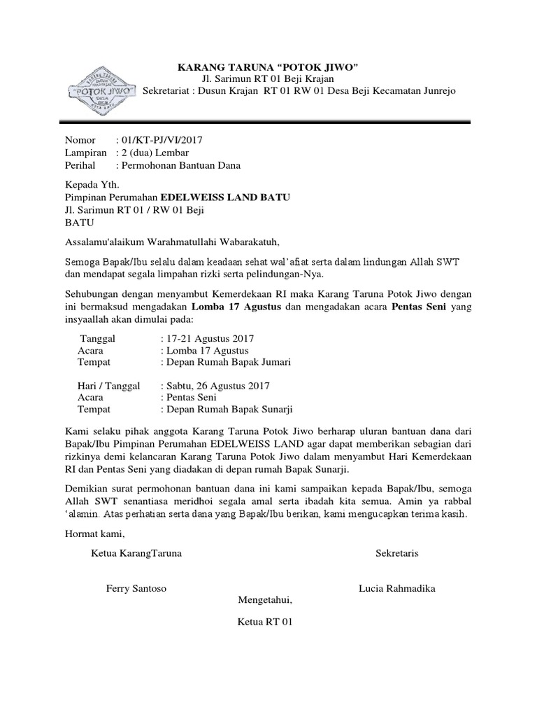 Contoh Surat Permohonan Bantuan Dana Kegiatan Yang Benar Suratkerja Com