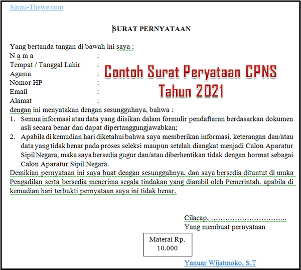 Surat Pernyataan Cpns Tahun 2021 Sinau Thewe Com
