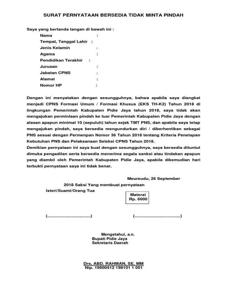 Contoh Surat Pernyataan Cpns 2021 Tidak Akan Pindah Tugas Sijori Kepri Sumber Informasi
