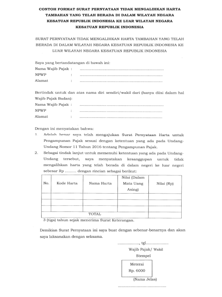 Contoh Surat Pernyataan Nominee Tax Amnesty Arasmi