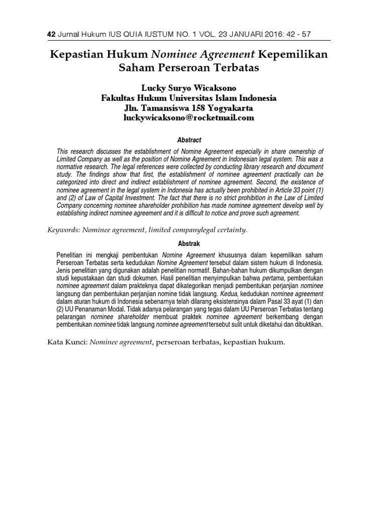 Kedudukan Hukum Nominee Agreement Dan Nominee Arrangement Dalam Penanaman Modal Pphbi Pusat Pengembangan Hukum Dan Bisnis Indonesia