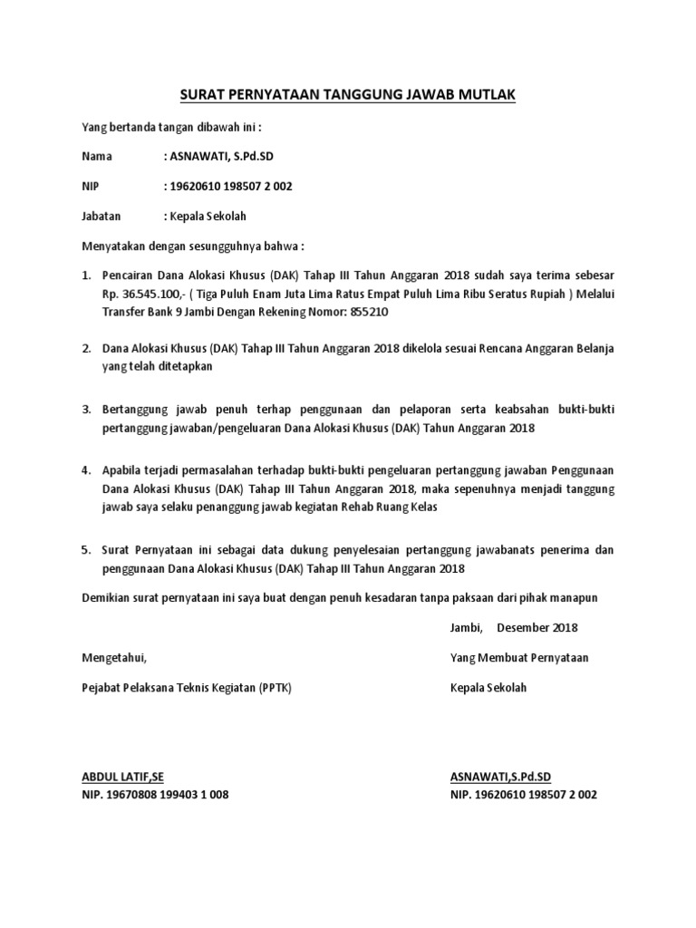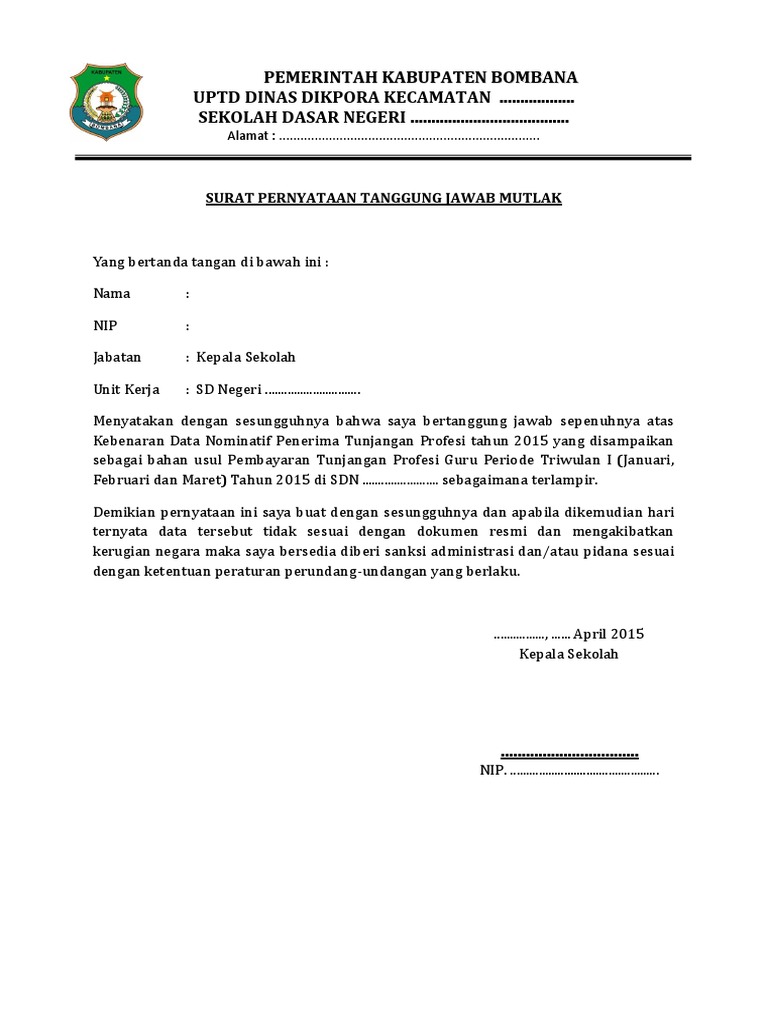 Surat Pernyataan Tanggung Jawab Mutlak Kepala Sekolah Tahun 2018 Websiteedukasi Com