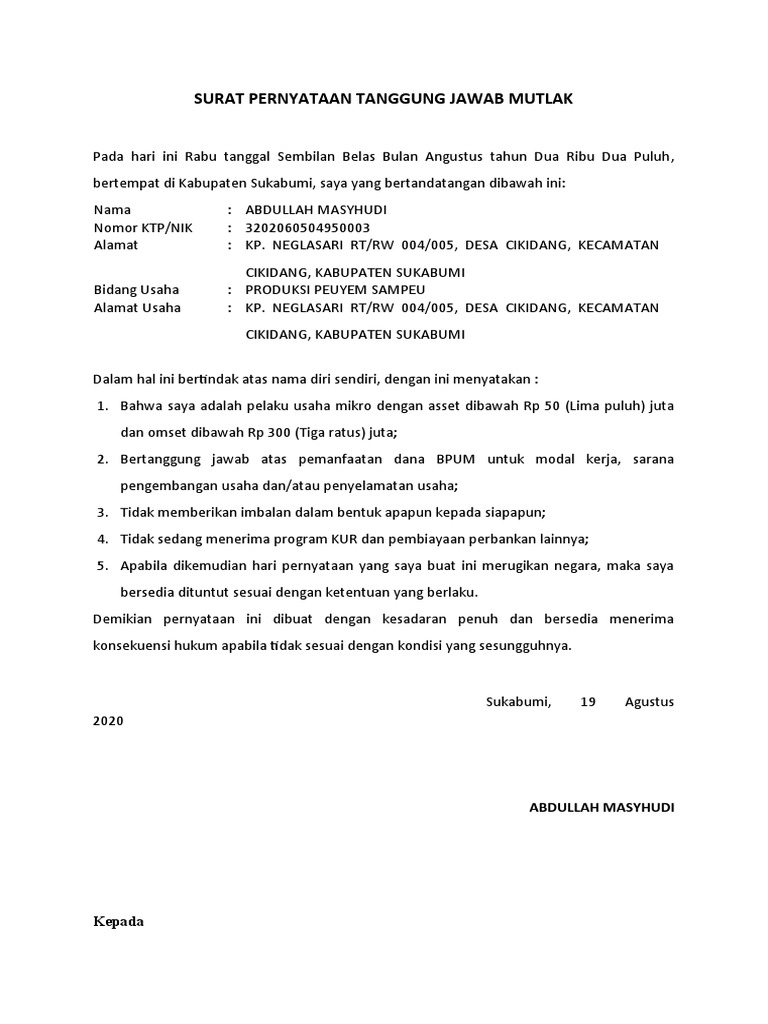 Contoh Surat Pernyataan Tanggung Jawab Mutlak Sptjm Media Desa