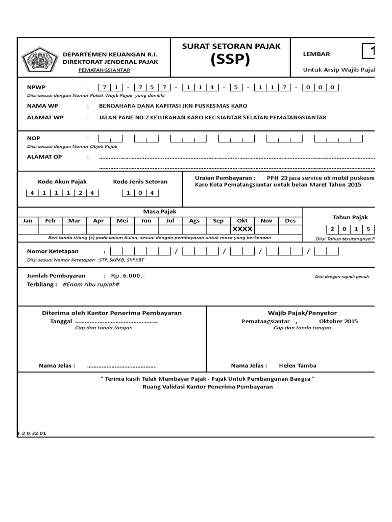 Ssp Surat Setoran Pajak Contoh Seputar Surat