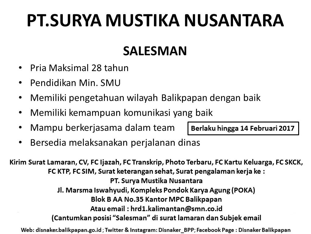 Disnaker Balikpapan در تÙÛÛØªØ± Lowongan Pt Surya Mustika Nusantara Lowkerbpn