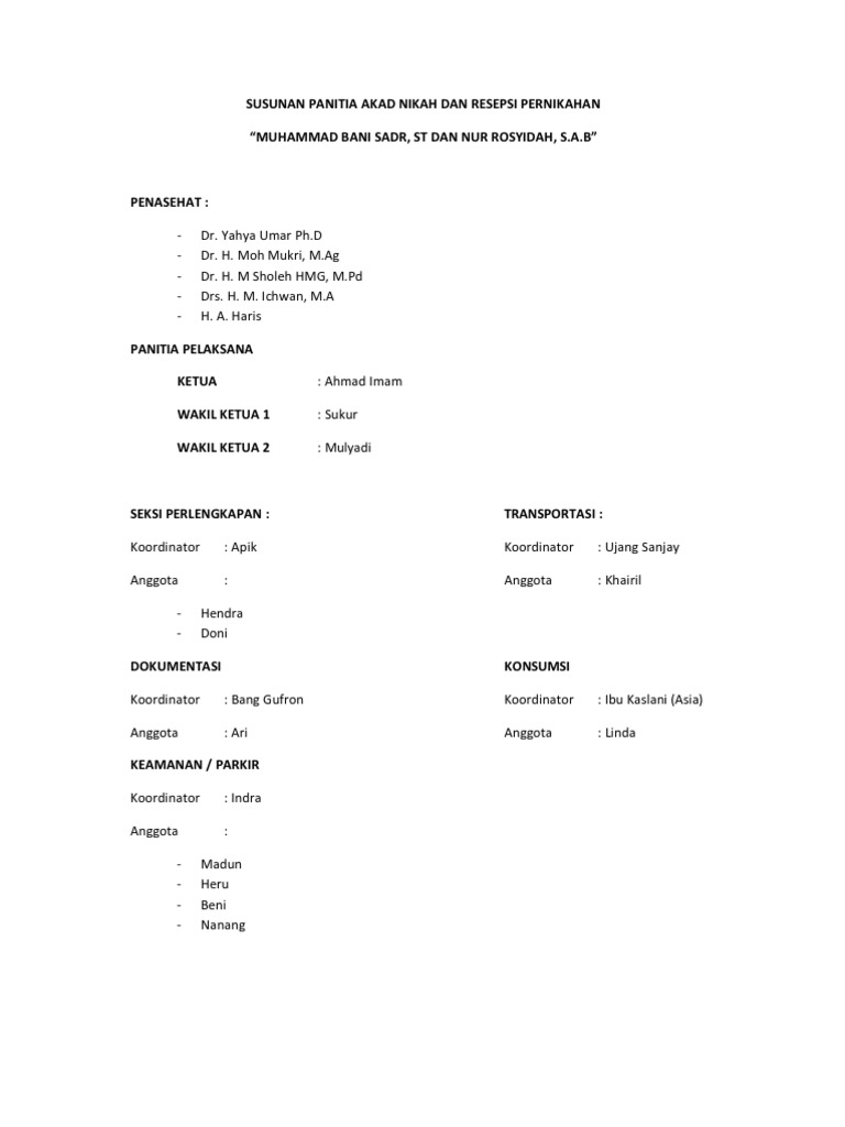 Susunan Panitia Resepsi Pernikahan Docx Document