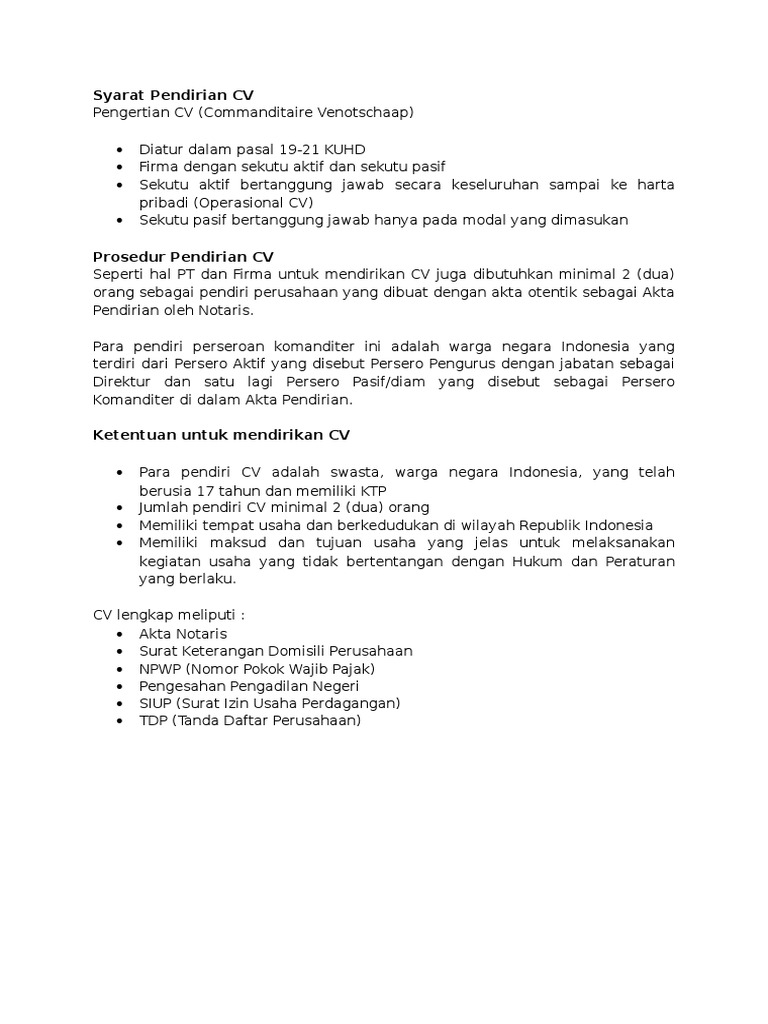 Persyaratan Dan Ketentuan Pembuatan Cv Pusat Legalitas