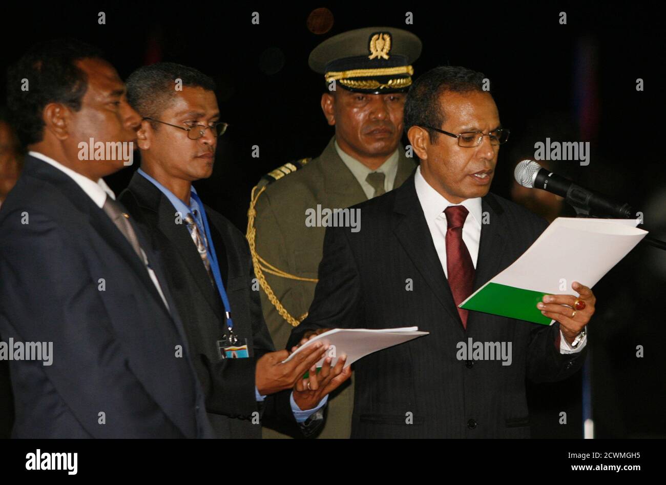 Newly Appointed East Timor President Jose Maria De Vasconcelos R Known As Taur Matan Ruak Reads An Oath During An Inauguration Ceremony In Dili May 20 2012 Reuters Lirio Da Fonseca East Timor