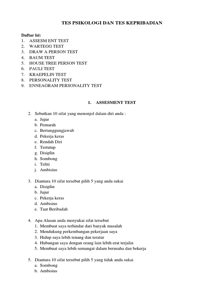 Tes Psikologi Dan Tes Kepribadian Pdf Document