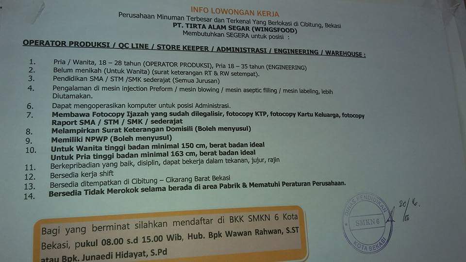 Loker Pt Tirta Alam Segar Pabrik Ale Ale Tingkat Smk 2021 Loker Karawang