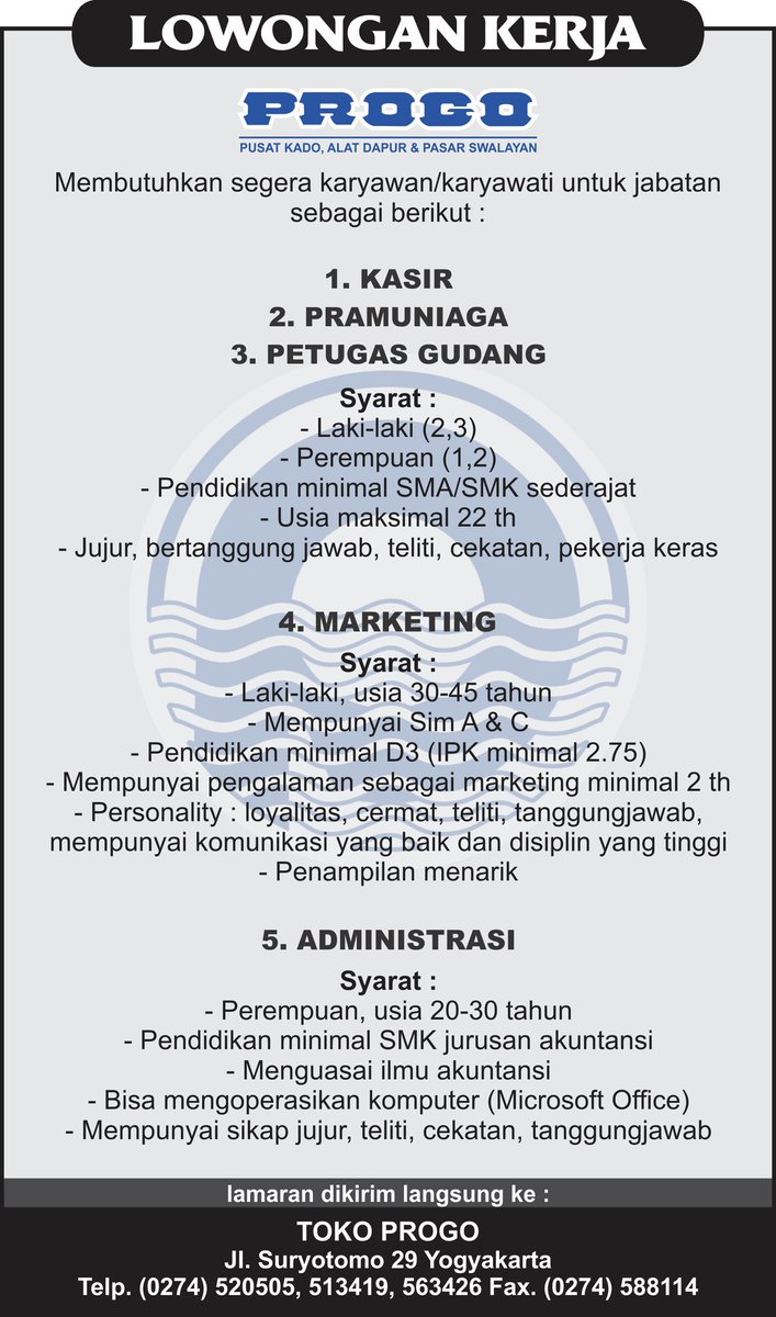 Segera Dibuka Sleman City Hall Pt Loji Surya Aditama Toko Progo Membuka Kesempatan Untuk Store Manager Supervisor Staf It Teknisi Kepala Gudang Staf Admin Pramuniaga Kasir Driver Kualifikasi Http Www Jogjakarir Com 2018 05 Lowongan Kerja Di Pt
