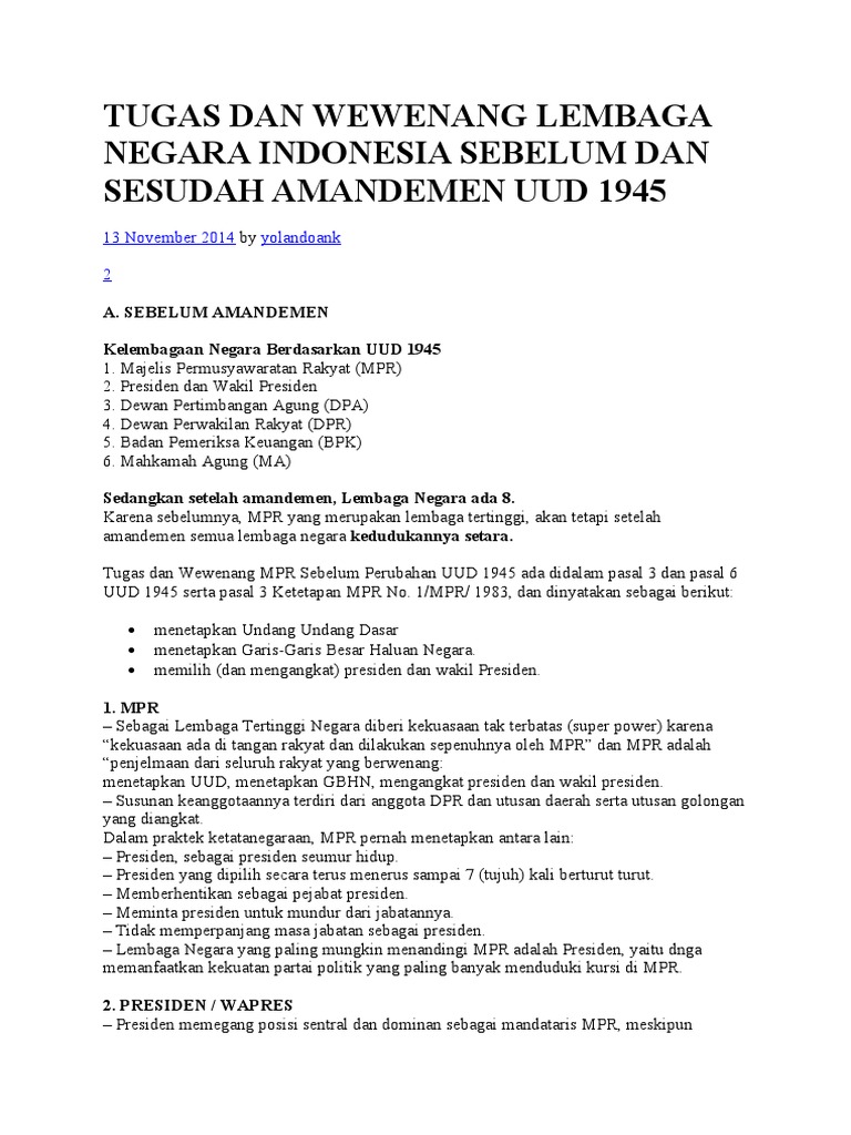 Tugas Dan Wewenang Lembaga Negara Indonesia Sebelum Dan Sesudah Amandemen Uud 1945 Sandelwood