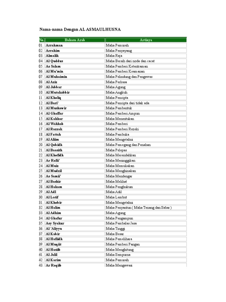 Nama Nama Dengan Al Asmaulhusna Nama Islam Pdfno Bahasa Arab Artinya 01 Al Quddus Maha Bersih Pdf Document