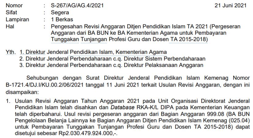Revisi Anggaran Ditjen Pendidikan Islam Ta 2021 Untuk Pembayaran Tunggakan Tunjangan Profesi Guru Dan Dosen Ta 2015 2018 Info Opm