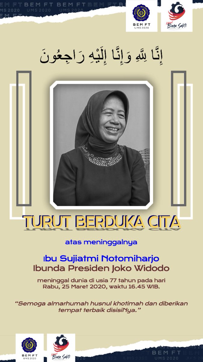 Bem Ft Ums On Twitter Innalillahi Wa Innailaihi Roji Un Turut Berduka Cita Yang Mendalam Atas Meninggalnya Ibu Sujiatmi Notomiharjo Ibunda Presiden Jokowi Semoga Almarhumah Husnul Khotimah Dan Diberikan Tempat Terbaik Disisinya Https T Co