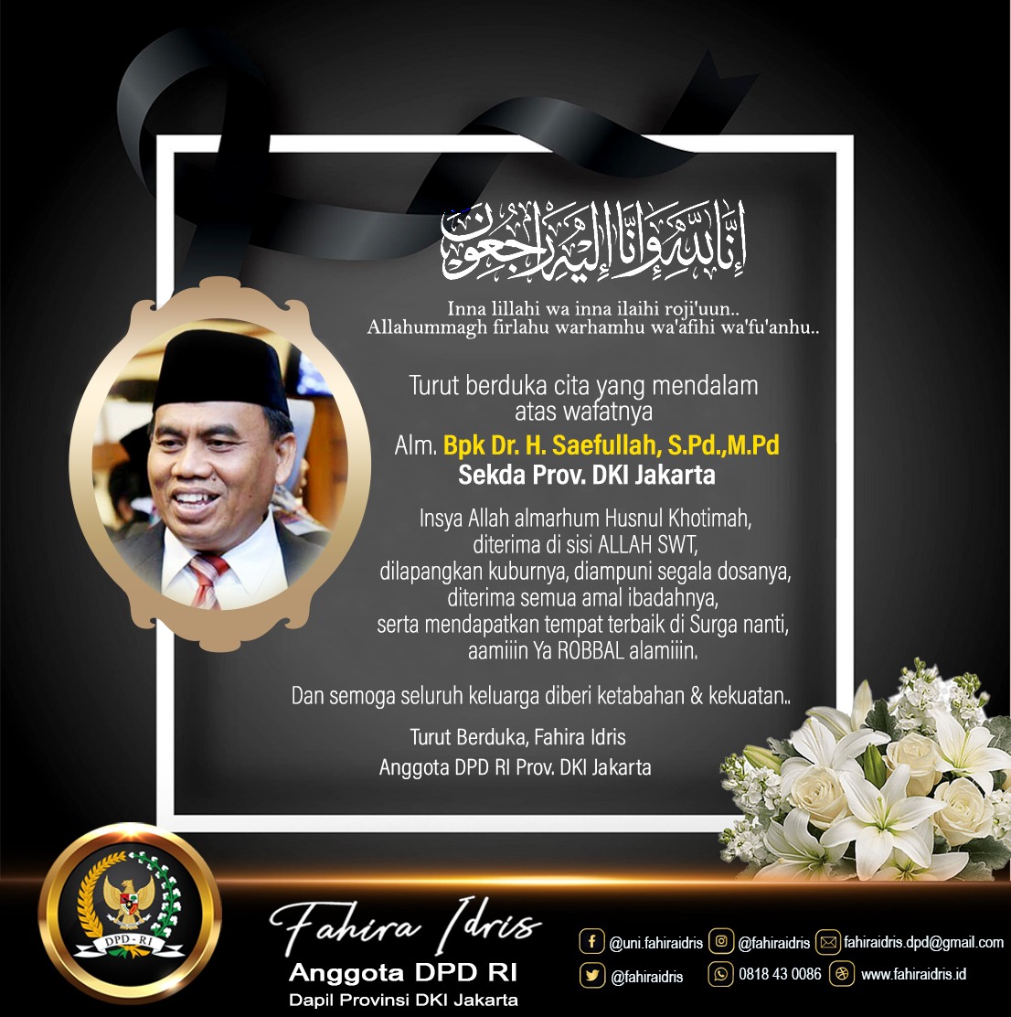 Fahira Idris Dpd Ri On Twitter Inna Lillahi Wa Inna Ilaihi Roji Uun Allahummagh Firlahu Warhamhu Wa Afihi Wa Fu Anhu Turut Berduka Cita Yg Mendalam Atas Wafatnya Sahabatku Bapak Dr H Saefullah S Pd M Pd Insya Allah