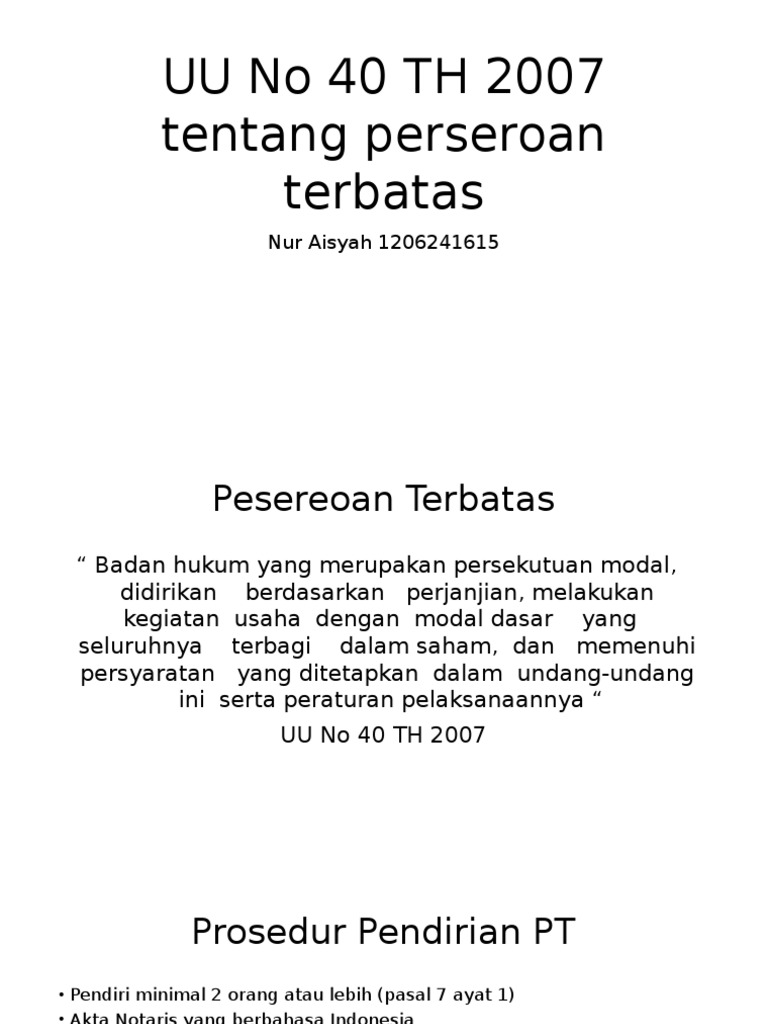 Pemahaman Uu No 40 Tahun 2007 Tentang Perseroan Terbatas