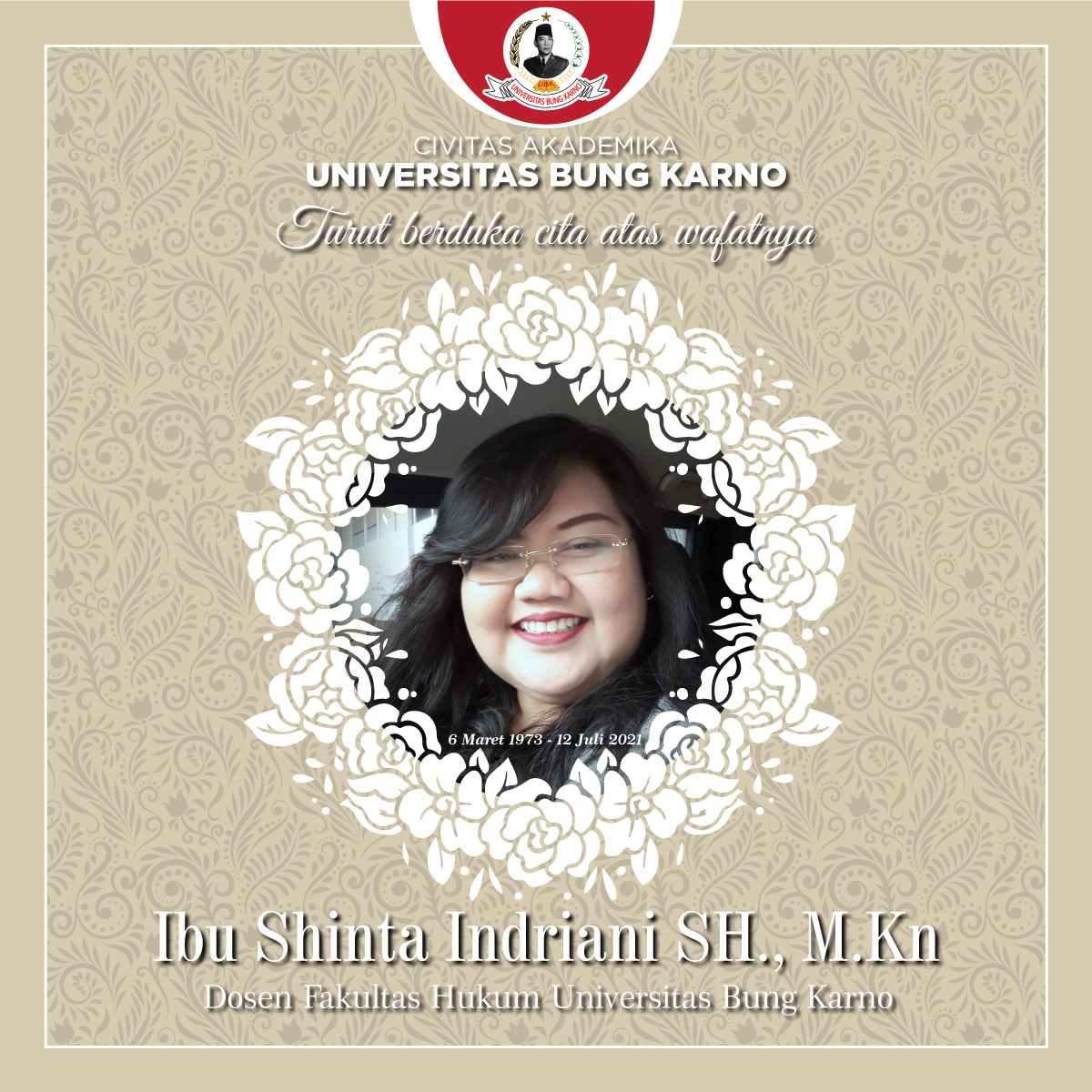 Univ Bung Karno On Twitter Civitas Akademika Universitas Bung Karno Turut Berduka Cita Atas Wafatnya Ibu Shinta Indriani Sh Https T Co Yzskpq9gab Dosen Fak Hukum Ubk Pd Senin 12 Juli 2021 Jam 16 00 Wib
